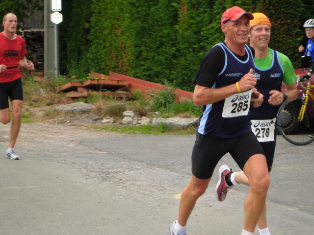 Toch tevreden over het verrichte trainingswerk van vandaag. Deze morgen weliswaar niet uit het bedje geraakt voor wat zwemwerk, maar deze dan toch uitgevoerd over de middag. Aangekomen in Menen en al bij al 2.2 km gezwommen. Zeer gevarieerd getraind mag ik wel zeggen. Goeie afwisselingen met kracht en technic peddels, zonder peddels, eens een snelle honderd, etc...En niet te vergeten mijn eerste zwemakkefietje met een oudere Franse dame. Monsieur ça c'est mon boulevard, en ze begon in mijn richting te stampen, dit zonder enige reden... Is er dan geen zwembad in Rijsel of zo ?? Vanavond, zoals iedere dinsdag, naar Menen voor een interval. Ik zou het aanvankelijk rustig aan doen. Een training van een 11 à 12 km/u gemiddeld, dit in een uurtje. Ik zou me, en heb me van de groep afgezonderd. Niet omdat ik kwaad ben op één van die lieve mensen, maar ik had even een solisten - momentje nodig. I-pod, en lopen... Een mens heeft dat eens nodig, dus why not me, myself and I. Na een 3-tal km opgewarmd te hebben, begon ik aan 10 *400 m versnellen, maar daartussen een 400 m recup. Ik maakte er een spelletje van om het boeltje een beetje levendig te houden. Rondjes van 400 m in snelheid moesten in 1.42 min uitgevoerd worden (gem. 14km/u) en de recuperatie in 2 min (12km/u). De seconden die ik te traag recupereerde, liep ik sneller. Zo simpel was het. Op een bepaald moment had ik zonder te weten een rondje gerecupereerd in 2.12 min, dus mocht ik een 400 m in 1.30 min draven... Wel eens plezant ! Daarna nog wat uitgebold en snel nog wat gekeuveld met Intervalfriends. Dinsdagavond is dan weer voorbij, en is het tijd om naar huis te gaan. Morgen wordt het hopelijk wat fietswerk, alhoewel ik nog niet weet hoe ik dat zal doen, want morgen vergadering en ik moet nog weg mijn neef met wagen en remorque... We zien wel. Greetz C Pic : samen met Mario (een loper van het betere kaliber) in "dwars door de Zilten". Een wedstrijd van 14 km die uitbolde in 58 min.