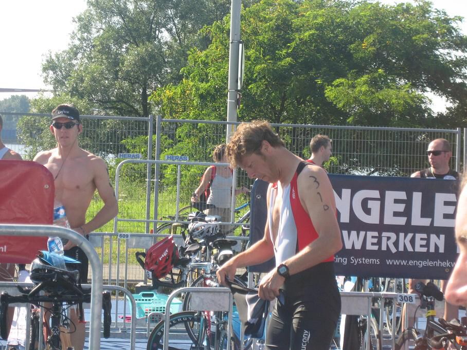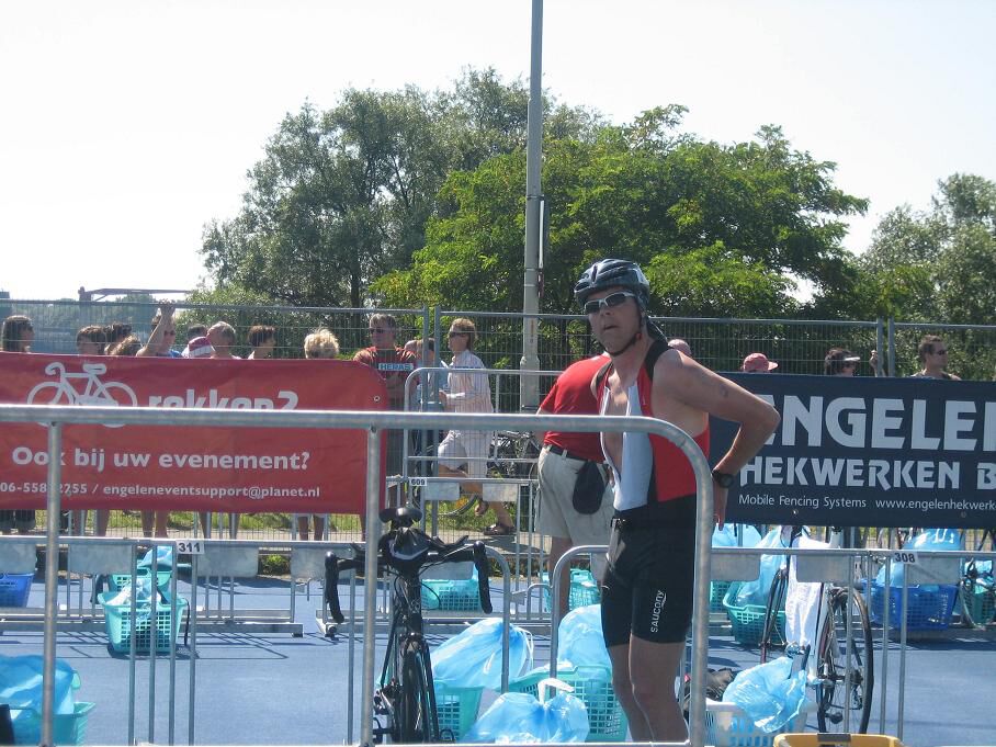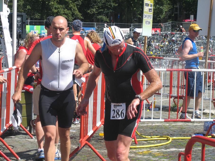 Johan vertrekt voor het looponderdeel. We hadden toen reeds 90 km gefietst, en 1.9 km gezwommen. Ter info was de t° toen ongeveer 33° in de schaduw. Maar jammergenoeg was deze voor ons niet weggelegd. Het was constant in de brandende zon te doen. Op de achtergrond zie je me staan in de ruimte der gestraften. Ik kreeg nl. geel om te stayeren... (wat helemaal niet waar was, maar tja...)