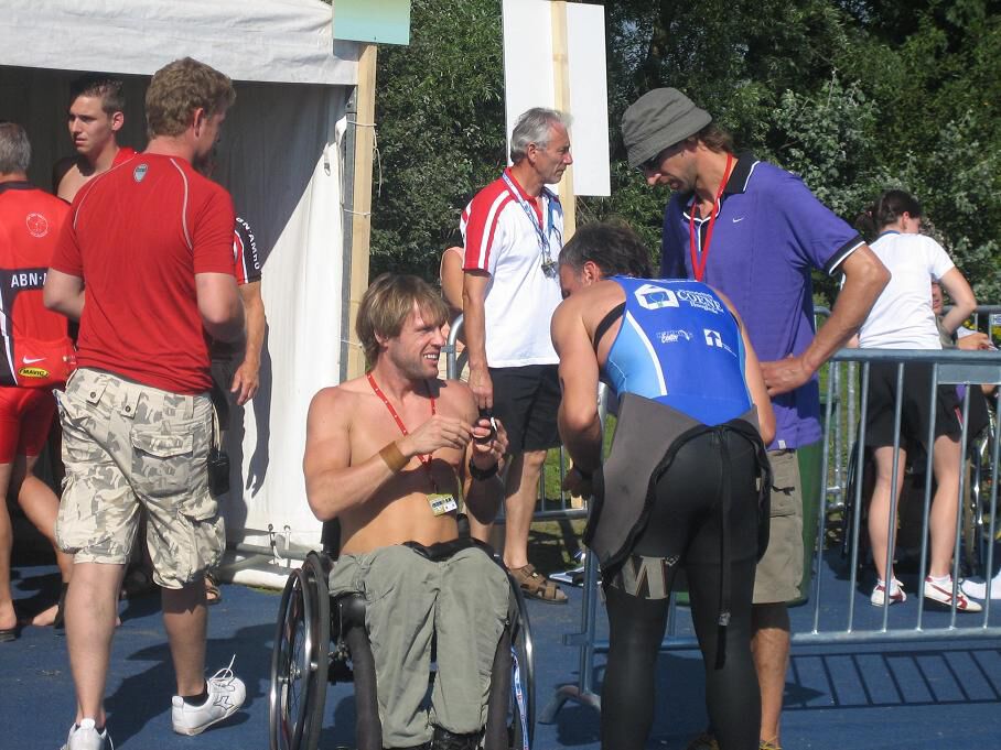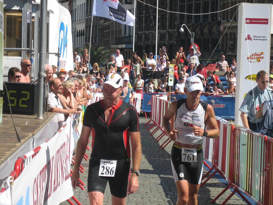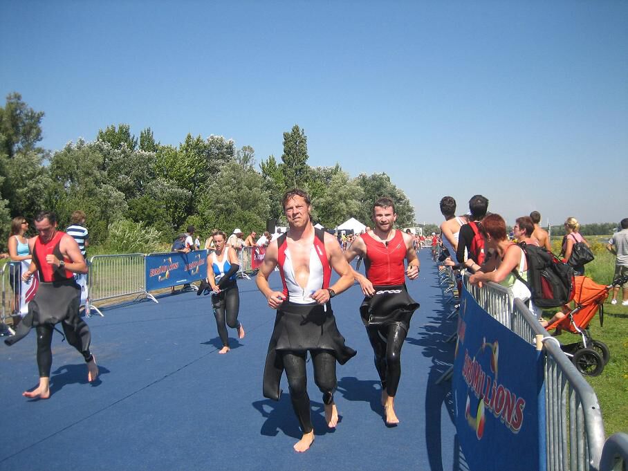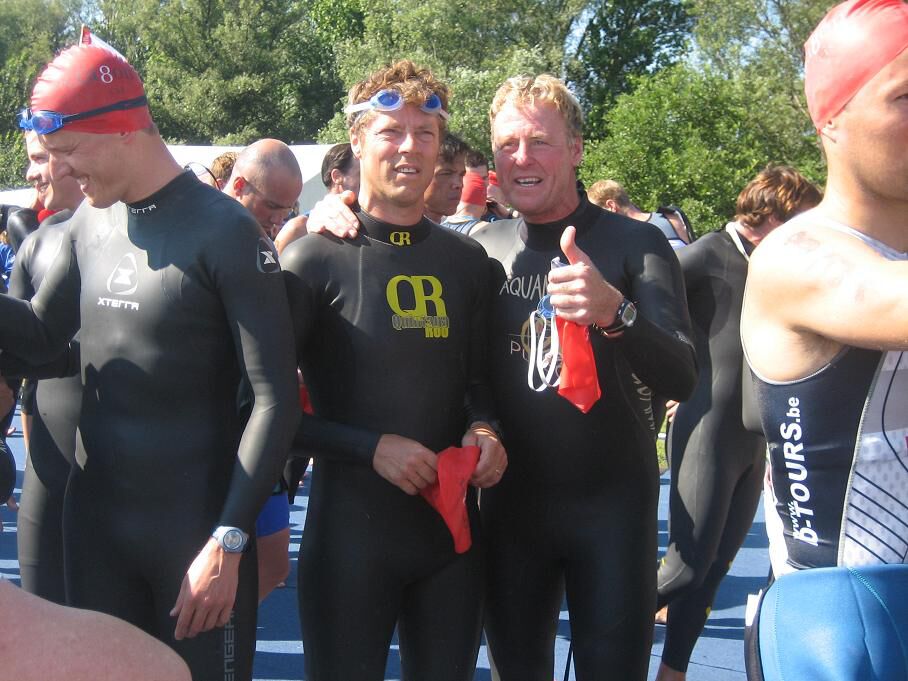 Op zondag stond ik op om 6u45, en na het douchen ging ik samen met Johan onze fietsen afhalen in de parking. Daarna gingen we met zijn allen ontbijten, waarna Johan en ik omstreeks 9 u vertrokken naar Linkeroever. Alles verliep heel ontspannen, en dit was duidelijk aan ons beiden te merken. Eens aangekomen in het Galgenweeldomein waar gezwommen werd, werden we onderworpen aan een eerste controle van ons materiaal. Daar bleek er een barst in mijn helm te zijn, en dit wist ik niet ! Waarschijnlijk eens van de kast gevallen of zo...Met het nodige geluk kon ik de vrouwelijke dame wat charmeren, en mocht zo met een verwittiging* toch verdergaan naar de fietsenstalling. * als ik volgende keer weer deze helm meedoe, word ik stante pede uit de wedstrijd geweigerd... Ze zijn streng, maar heel rechtvaardig ! Vervolgens begaven we ons naar de plaats waar het zwemmen startte, en toen begon de harteklop toch wel in de keel te bonken. Amai, al die atleten, zo ne groten visput, brrrrrrrrr...als da maar goed afloopt. Wij mochten helaas geen opwarming genieten in het water, dit was alleen voor de PRO voorbestemd, maar mochten er een kleine 5 min voor de start toch in. Gezien mijn eerste deelnamen besloot ik achteraan te starten, wat niet direct mijn slimste beslissing ooit was. En dan om 11 u - Bang - Patat, we zijn weg... Het werd al snel duidelijk dat menig zwemmers die voor me uit zwommen een stuk trager waren dan mij, maar die laten je er bij god niet door zunne, of toch heel moeilijk. Op een zeker moment lag ik te peddelen naast Bromke de Beer, iemand die 2x mezelf is en waarschijnlijk met de slag verliefd was op mij. Allez ik had toch die indruk bij momenten. Zwom ik naar links, hij ging mee, ging ik naar rechts hij ging weer mee, maar steeds al trekkend en stotend. Uiteindelijk maakte ik hem duidelijk dat ik niet wou ingaan op zijn avances, en dat leverde me kortweg een ferme stamp op in de buikstreek. Ik dacht dat het de lever was, maar het gaat om een scheurtje in de buikspieren, en waarschijnlijk een darmkronkel. Van Fairplay gesproken. Maar ik heb o zo een goed geheugen voor degenen die me iets aandoen. Na wat op adem komen, kwam ik uiteindelijk weer in mijn ritme, en kon wegens het uitgestrektere peleton toch heel wat inhalingen uitvoeren. En...wie kwam ik tegen, ja hoor ons Bromke, ik ging er voor gaan zwemmen en peddelde eens goed in 6-tact tegen zijn brilletje wat hem ook een stop opleverde... Katje mie katje were...Normaal ben ik zo niet, maar ik kon het niet laten... Na 38 min was uit het water en deed een heel trage wissel. Ik wou niks aan het toeval overlaten. Alles meehebben was een must. Ik was toen ik vertrok een goeie 6 minuten achter Johan, maar dit speelde voor mij geen rol. J. geniet meer ervaring, is een beter zwemmer - fietser, ik moest niet naar J. kijken, alleen maar luisteren naar mezelf. Trouwens was ik heel blij dat het goed ging met J. want ik had de indruk dat de moraal (vooral door de hitte niet zo goed was), dus dacht ik goeie start is half gewonnen. Toen mocht ik de fiets op, en hier was mijn grootste vrees vooral lekrijden. De organisatie had de pijnpunten op het parcours zeer mooi aangeduid, en deel met rubberendoeken (vooral aan overwegen) bedekt. Het verdomd lekker op de fiets. Mijn benen waren goed uitgerust, en ik kon er redelijk vollen bak tegen aan. Na een uurtje fietsen had ik reeds een 35 km gereden, wat toch een aardig gemiddelde is gezien je alles alleen moet doen. Van km 1 had ik een vriendelijke meneer die constant mijn wiel koos, en zo 90 min van mijn werk profiteerde. Aan km 45 had hij de motoren met daarop de referees horen aankomen, en nam asap de rol over. Ik was me van geen kwaad bewust, en wou uit dit wiel gaan, maar toen was meteen de moto bij mij die me een gele kaart toekende wegens stayeren. Dit betekent dat ik 3 minuten straftijd moet uitzitten na het fietsen, vooraleer te starten met lopen. Gelukkiglijk kreeg deze heer ook geel, want dit was meer dan terecht. Nog niet geleerd van zijn straf bleef hij tot aan het eind in mijn wiel hangen. Ik reed op dat moment wel met de schrik op het lijf want nog 1 kaart en game over... Aan km 50 had ik J. gezien en had ik een achterstand van 2m30s. Aan km 80 kwam ik bij J. die duidelijk al last had van de keiharde zonnestralen. Ze waren voor menig goed getrainde, ervaren sporters, onverbiddelijk. Tijdens de wissel deed ik weer alles heel rustig en gecontroleerd, om dan naar de strafbox te begeven. Mens wat kan 3 min lang duren, vooral als je daar moet staan met degene die je dit gelapt had. Achter alles hebben we er nog om gelachen hoor. Die vent was een kieken eerste klas, en ik kon er eigenlijk niet kwaad op zijn. Toen ik mocht vertrekken voelden de benen nog heel super en zat mijn kopje ook nog heel sterk fris. Ik zou mits alles verder goed ging wel eens kunnen binnen zijn rond de 5u20 à 5u30, wat voor mijn eerste deelnamen niet slecht zou zijn. Maar na een 100-tal meter sloeg het noodlot toe. Ik kreeg halfwege mijn rug een pijnscheut van je welste, die immediatement alles rond het middenrif vastzette. Ik kreeg geen lucht meer, de rugspieren spanden zich helemaal op, kortom mijn wedstrijd GEDAAN ??? Ik werd meteen verplicht om te lopen aan een tempo van 8 à 9 km/u, en zelfs dit was nauwelijks nog haalbaar. Lopen zonder ademenen gaat nu eenmaal niet, niet aan 9 - niet aan 15km/U. Het was een gevolg van de stamp van Bromke... J. haalde me bij met de tekst "yesterday, all my troubles seems so far away", terwijl ik wel plots moreel een zware opdoffer aan het verwerken was. Mijn sterkste wapen, was plots mijn grootste probleem, dat kon toch niet. Even verder vroeg ik J. me eens op te tillen, er kraakte één en ander in de bovenrug, maar niet voldoende om weer te kunnen lopen naar wens. Aan km 6 zag ik de supporters op de grote markt (plaats aankomst) en dacht ik even aan stoppen. Het was niet meer menselijk. Maar ik wou en zou me niet geven, ik gunde het vooral Bromke niet, want deze was ook al een eind 