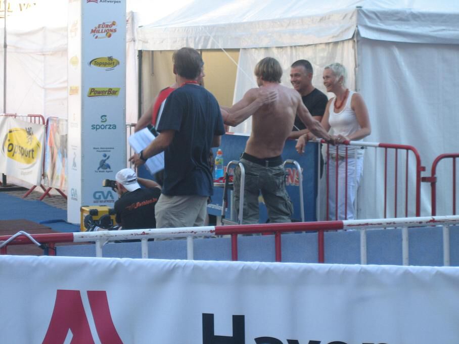 Hier was het me een ware eer mijn medaille, als finisher, te mogen ontvangen van Marc Herremans. Dit is iemand waar ik enorm naar opkijk, en het is dan ook des te prachtiger als deze gentleman uw verwelkomt aan de meet. Een kippevelmoment met nog een vleugje humor, want waarschijnlijk sloeg ik daar weer ne raren uit mijn botten aan de lachende gezichten te zien. Maar ja, wat verwacht je van zinnige praat na 6 uren intensief te sporten...
