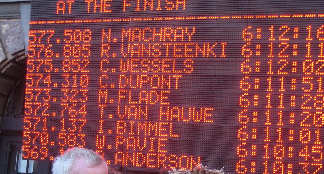 Mijn naampje op het electronsich scorebord..... Ik kwam samen binnen met een gast uit het Gentse, een zekere Filip. Ik heb, gezien hij niet in het klassement voorkomt, de indruk dat hij zijn looprondes verkeerd telde. Heel spijtig want het nochtans een toffe gast, waarmee we samen nog konden lachen in onze ellende... So that's all.... Greetz C