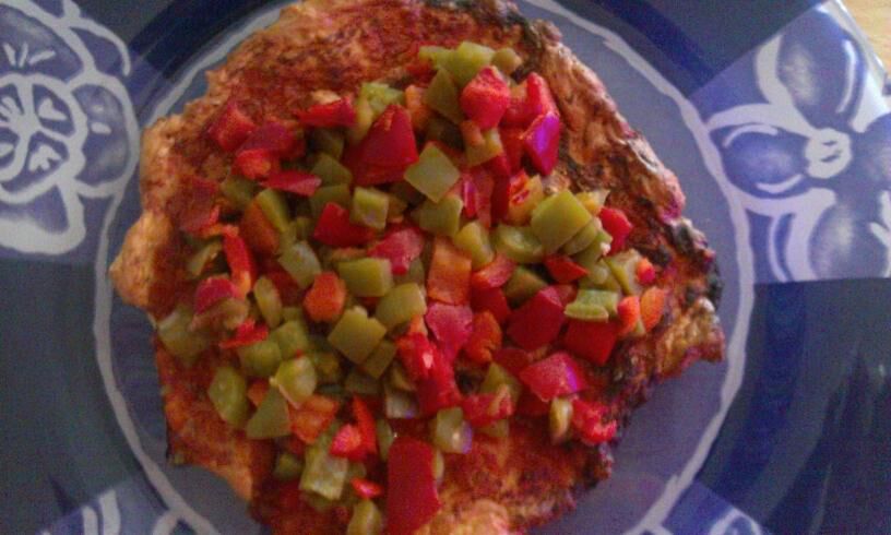 Terwijl mijn eerste pizza (foto) bv een platte droge saaie bedoening was heeft Manlief geleerd om mijn eten te pimpen met de toegelaten groenten.