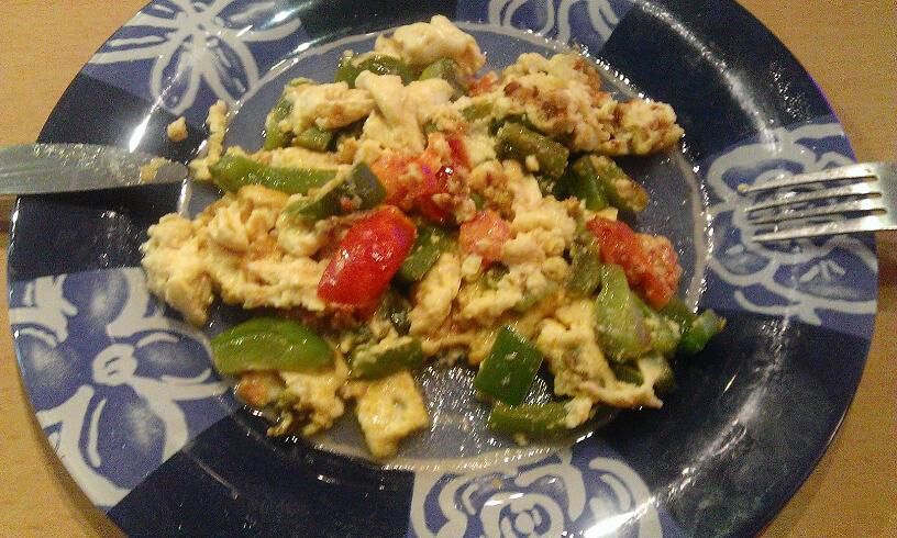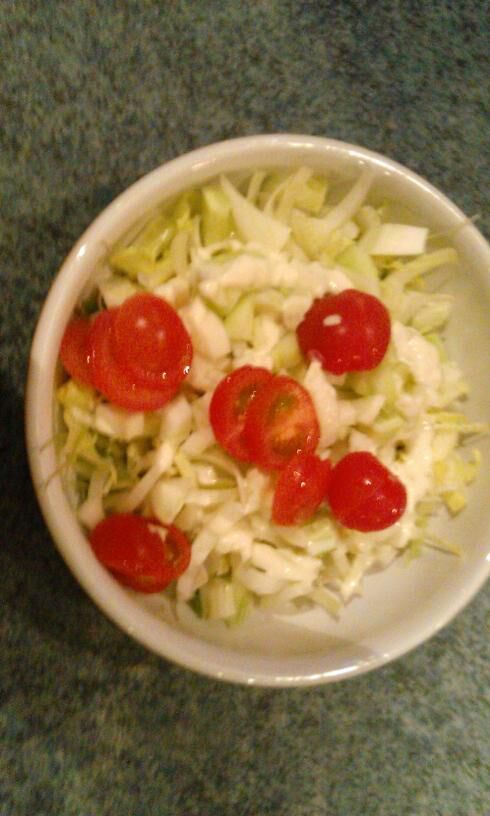 Aan tafel heb ik een gebakken broodje bij en bedien mezelf met de sla, tomaat en komkommer op de tafel.