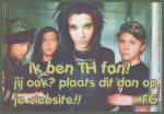 Biografie Tom Naam: Tom Kaulitz Geboorteplaats: Leipzig Geboren op: 1-9-89 Woonplaats: Loitsche Sterreteken: Maagd Lengt: 1,80 Haarkleur: donker blond Oogkleur: bruin Broers/zussen: Zijn eeneiige tweelingbroer Bill Tatoeage: geen Piercings: 1, links in zijn lip Hobbys: Muziek, had nooit andere interesses. Levensmotto: Heb er geen meer, omdat ik ze toch niet opvolg ;-)(in sommige intervieuws staat : carpediem:p) Andere leuke feitjes: Eerste zelfgekochte album was van: Aerosmith eerste concertbezoek was concert van: Samy Deluxe Haarproducten: wax speciaal voor dreadlocks Lievelingsvak op school was:Kunst, maar haat school eigenlijk uit principe. Minst geliefde vakken op school waren: wiskunde en natuurkunde Lievelingsdrinken: Redbull en Cola Lievelingsstad: Tokyo Lievelingsautos: Hummer en BMW Cabrio Mobiel: Sony Ericsson T630 Idool/voorbeeld: nog nooit gehad Huisdieren: doberman-labrador scotty, en kat Kasimir Houdt niet van: de onaangeraakte natuur, (vooral de kleinen beestjes die daar wonen) Hij is 10 minuten ouder dan Bill Actuele lievelingsband/artiest: Samy deluxe Actueel lievelingsnummer: Glamores Wens: Nog steeds een ontmoeting met de Olsen Twins of Angelina Jolie. Bijnaam: Heb geen echte bijnaam, maar men noemt mij ook graag seksgod ;-) _________________________________________________________________________