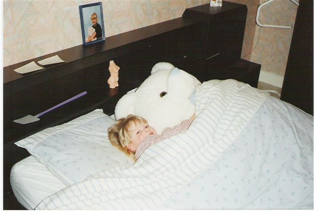 shana mocht met grote beer in t grote bed bij papa liggen omdat mama en broertje naar t ziekenhuis waren om een wiegedoodtest