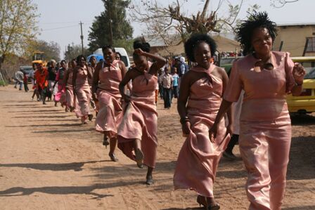 Na het eten nog even wachten op broeder Sam want hij zou ons brengen. Toen we hem zagen moesten we even goed kijken want hij had een kostuum aangetrokken. Blijkbaar zou hij ook op de trouw blijven dachten we dan maar. Maar goed, allen de auto in en richting de trouw. Eerst nog even binnen bij Baby thuis goeiedag zeggen tegen de zussen en de vele kindjes. Ook haar oudste zus was er gisteren en amai wat lijkt die goed op haar mama! Maar goed, terug ter zake. Maria (Baby haar mama) nam ons mee naar de buren, waar de trouw doorging. Al veel volk en één of andere man die iets aan het verkondigen was, maar daar verstonden we natuurlijk niet veel van. Bleek dat dit de priester of pastoor, of hoe je die mens ook moet noemen, was die ja aan het preken was. Baby zag ons en onmiddellijk moesten er twee mensen plaatsmaken voor ons en kregen we een plaatsje in de tent aan de mooi versierde tafels tussen de bruidsmeisjes en jongens. Alweer een voorkeursbehandeling dus voor deze twee blanke meisjes. Weer stonden er een aantal sprekers op het programma waar we jammergenoeg geen woord van begrepen. Baby was ondertussen bij ons in de buurt komen zitten dus tijd voor enkele vraagjes. We vonden dat die bruidegom er toch echt wel piepjong (jaar of 15) uitzag. Maar oei oei, wij met onze Westerse trouwideeën dan ook. Dat was helemaal de bruidegom niet. Wat bleek nu: de trouw was een trouw tussen een jongere vrouw en een oudere vrouw. Geen lesbisch koppel zoals sommige nu denken, maar die oudere vrouw heeft zelf geen kinderen. Omdat ze dus iemand nodig heeft om voor haar te zorgen, heeft ze die andere vrouw gekozen. Leboa (of hoe het ook noemt) betaald aan haar familie en nu werden ze dus vereeuwigd. Zo zal die jongere vrouw aanschouwd worden als een dochter van die oudere! En wie is die jongen dan? Wel dat is zoon van de bruid! Probeer dit als Westerling maar allemaal even een plaatsje te geven. En dit was nog niet alles! Wij vroegen ons dan natuurlijk af hoe het zit met die jongere vrouw. Stel dat ze verliefd wordt, kan ze dan nog trouwen. Nee trouwen kan niet meer, maar kinderen krijgen van andere mannen is geen probleem . Wat een cultuur .