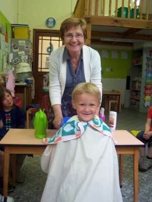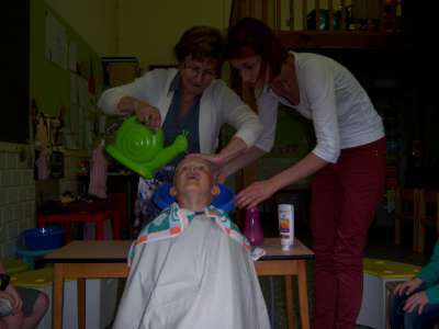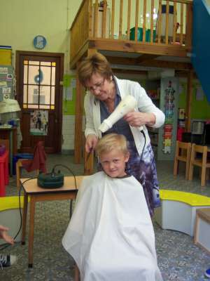 We werkten deze week rond het thema Kapper in de klas... Op dinsdag kregen we bezoek van kapster Clementine! Een heleboel kleuters stonden te springen om hun haartjes te laten knippen... Kamiel was de gelukkige! Zijn haartjes werden gewassen, geknipt én gedroogd! Wat een spektakel in de klas! De kleuters keken hun ogen uit! Daarna waren ook de anderen aan de beurt... Onze kleuters lieten hun haartjes mooi leggen, de meisjes kregen prinsessenvlechtjes en de jongens stoere gel! Iedereen zag er op én top uit!