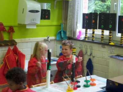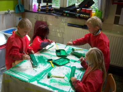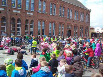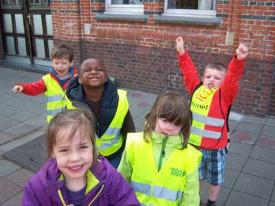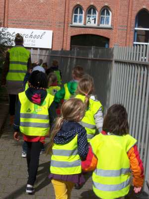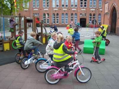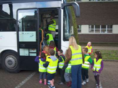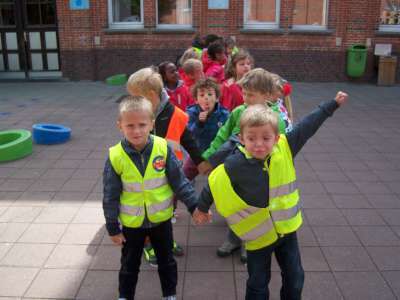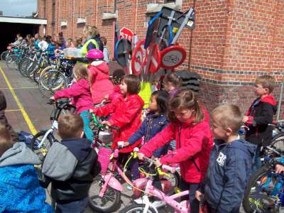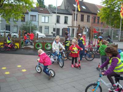 Verder gingen we in de klas ook aan de slag om eigen verkeersborden te ontwerpen én een verkeerslicht te schilderen. We gingen ook op pad met de kleuters van K3A&B richting de bus om daar een 'bus evacuatie' te oefenen. En natuurlijk hebben we vooral gefietst, vééél gefietst!! ;)