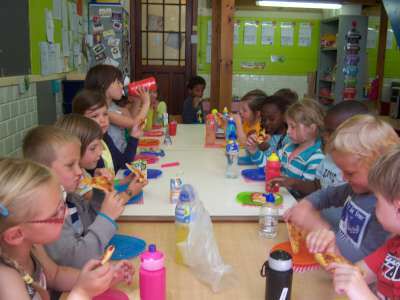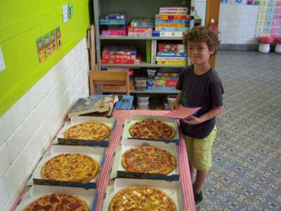 Onze klas werd omgetoverd tot een echt pizzarestaurant! Er werden aan de lopende band pizza's besteld, klaargemaakt én geleverd! We hadden zelf een delivery service per fiets! ;)