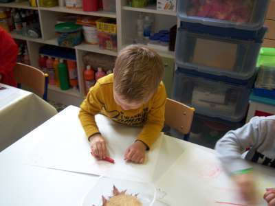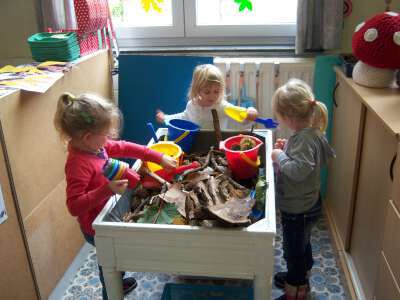 Onze zakjes werden gretig gevuld en zo namen we 'de herfst' mee naar onze klas! Onze zandbak maakte plaats voor alle gevonden herfstmaterialen, we stempelden een herfstboom, we toverden herfstblaadjes, en we gingen ook opnieuw aan de slag met onze schrijfdans...