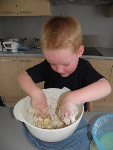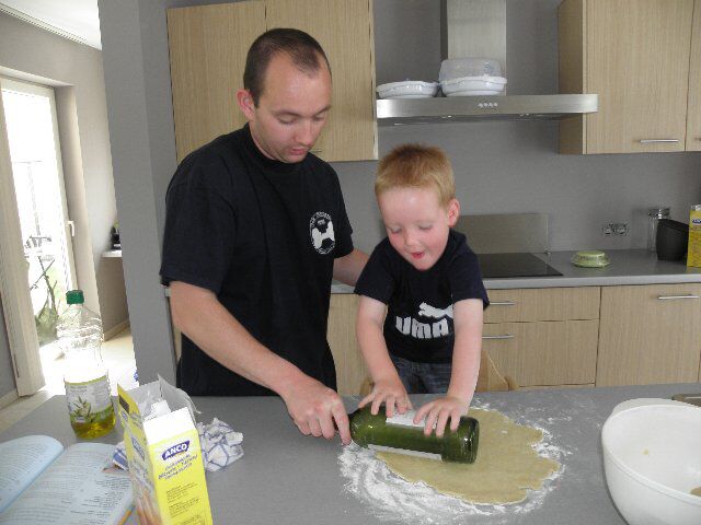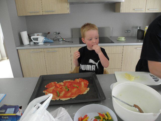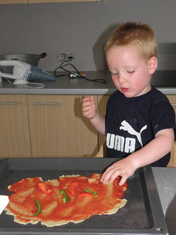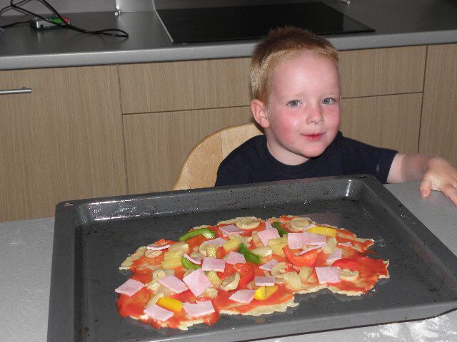 Hoe druk kan het leven van een 3 jarige kleuter zijn?! Eerst samen met papa pizza maken! Super leuk, zelf deeg kneden, bloem knoeien, pizzasaus smeren, groenten erop leggen, veel zelf proeven... En eerlijk waar, het was een erg leuk moment zo met zijn 2, en het resultat was erg lekker!
