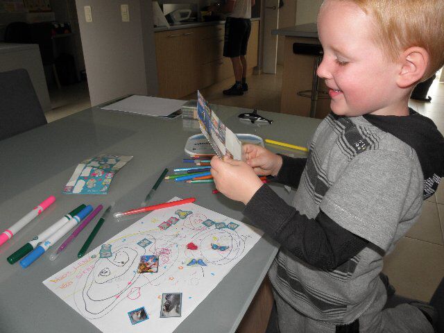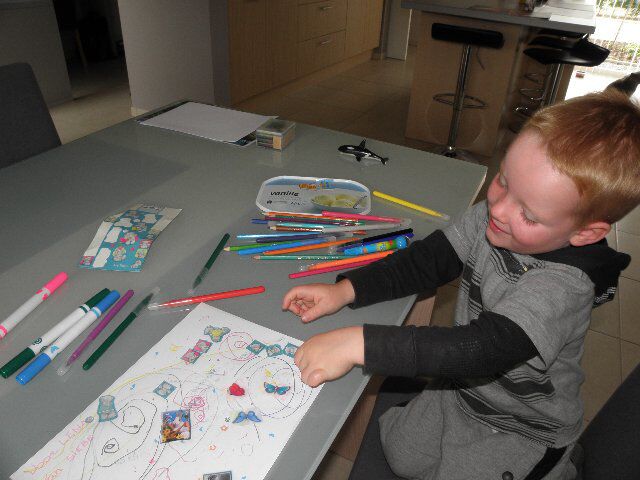 En dan nog knutselwerk. Want na het ontvangen van zijn eerste "liefdesbrief" van Lena moest hij toch een briefje terug sturen! Dus dan maar stiften, stempels en stickers bovenhalen en voila, Siebes eerste brief is klaar! Lena was uiteraard zeer vereerd!