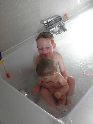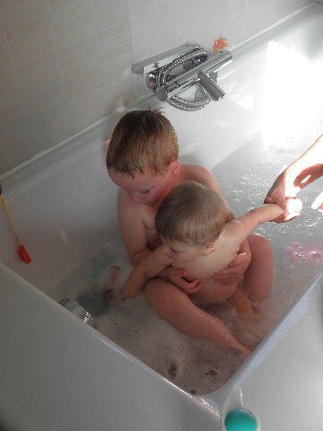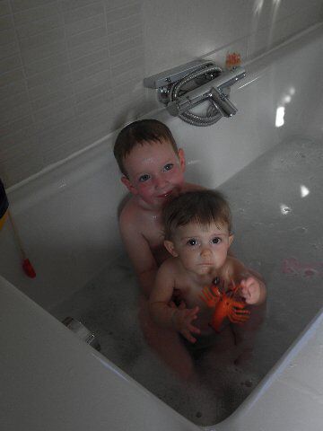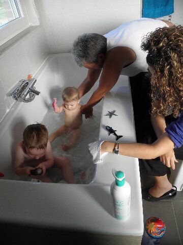 Van Siebe in bad hebben we al honderden foto's. Maar toch werd het deze keer iets speciaal. Want Joye was even thuis en het was wastijd, dus mochten de 2 kadees eens samen in bad! Voor Joye een hele belevenis, maar ook voor Siebe. Zo een kleine meid in bad, is toch anders dan alleen.