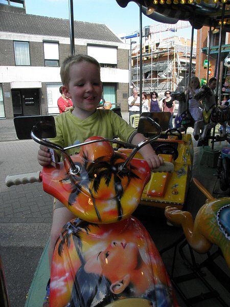 Het stelt niet veel voor, maar een kinderhart is snel gevuld: Kortessem Kermis met toch wel een draaimolen, eendjesvissen en auto's om in te rijden! Een leuke uitstap met zijn peter, en dan nog een klasgenootje (Jurmen) tegen gekomen! En voor het eerst 'de flosh' kunnen vangen op de molen en dus nog een keertje mogen rijden! Glundering in de ogen alom!
