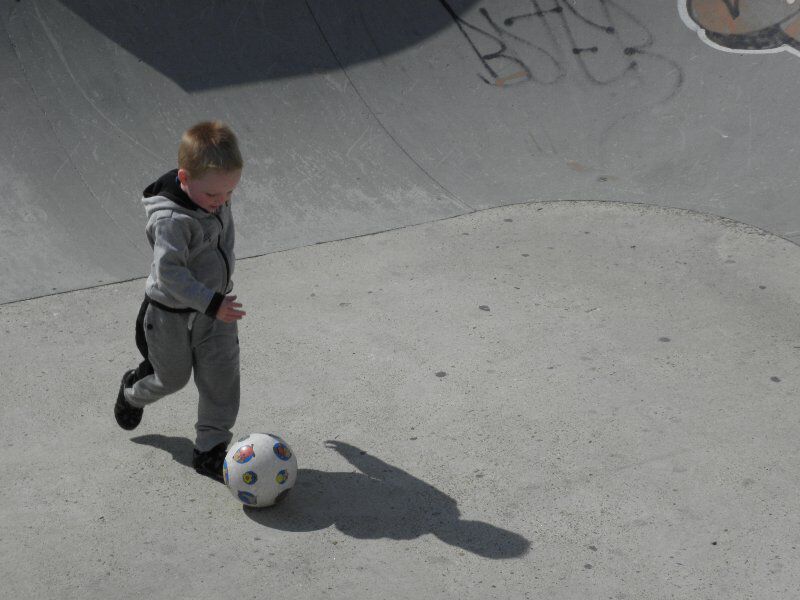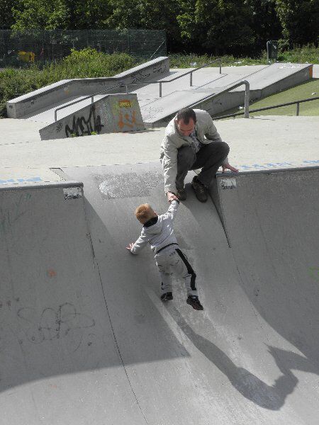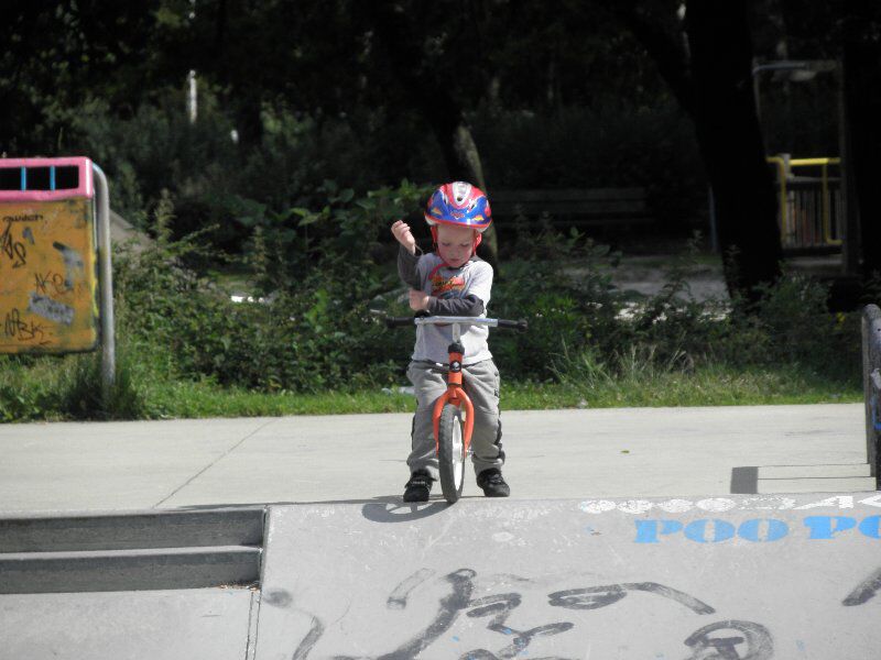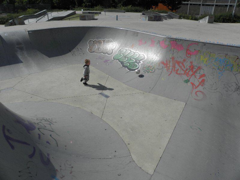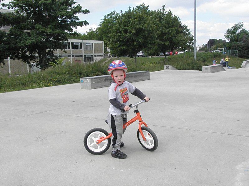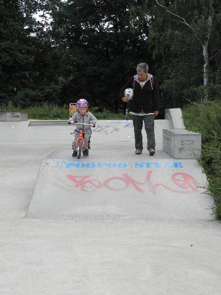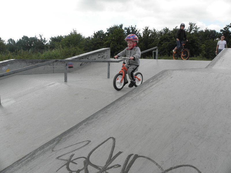 Om onze kleine heer bezig te houden in de vakantie zijn we naar Hasselt Skatepark gegaan. Het idee was om de speeltuin te doen en wat te voetballen of fietsen. Maar daar kwam snel verandering in: Siebe ontdekte dat hij met zijn loopfiets kon meeracen met de grote BMX-ers! Over de schansen, langs de trappen, op en af... Megacool! En dus spek naar de bek van onze durfal!