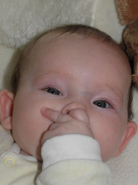 Onze kleine zus maakte vandaag, na 4 maanden niets dan melk, voor de eerste keer kennis met een andere vorm van eten: haar allereerste koek! En niet te geloven, maar eigenlijk wel te verwachten, ruilde ze die al zeer snel om voor haar welvertrouwde ... duim! Niet te schatten, maar geweldig om zien!