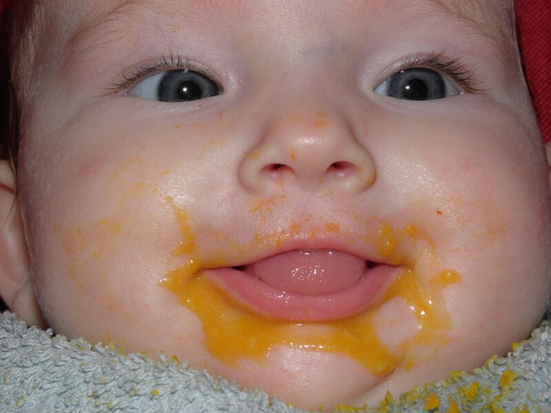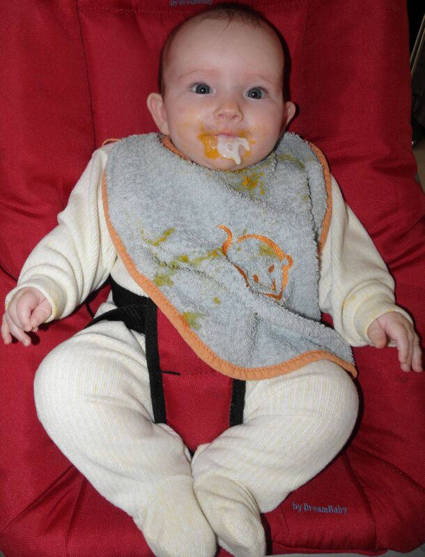 Groot genoeg is ze nu, onze dame. Eindelijk groot genoeg voor iets anders dan melk! De laatste keer borstvoeding zit er op , en dus komen de vitamientjes nu via de groenten. Ze heeft al worteltjes, pompoen en spinazie binnen. En onze dame doet het eigenlijk heel goed! Met deze mooie beelden als resultaat. En als ze erna nog melk drinkt geeft dat nog mooiere kleuren... en veel was!