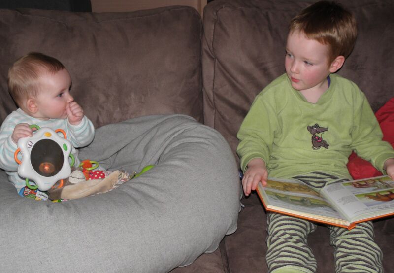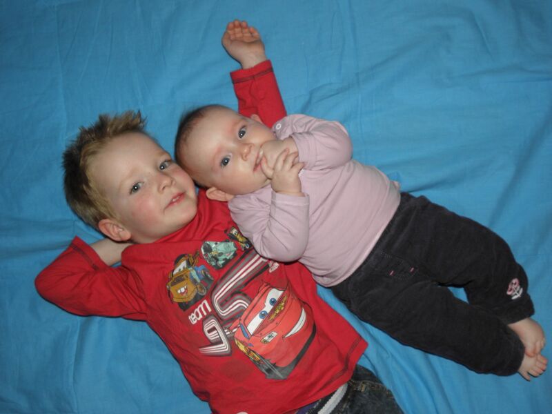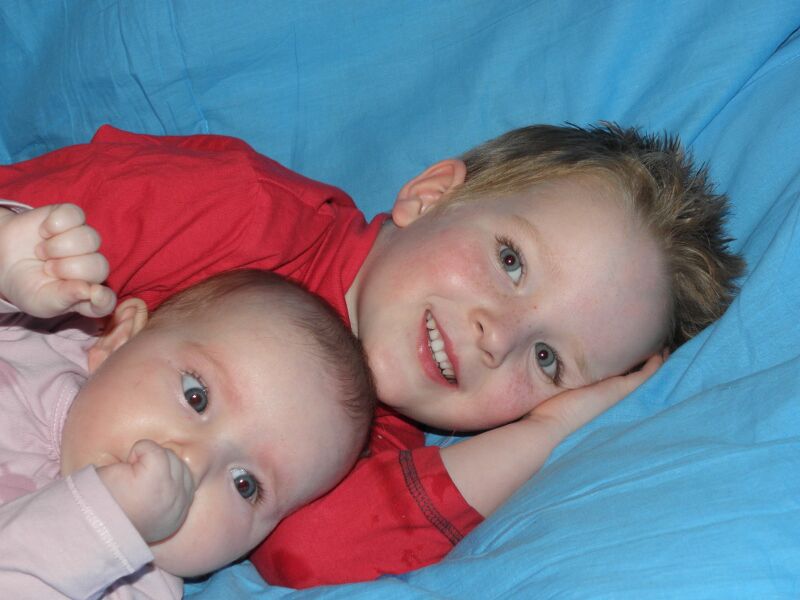 Knap om die eerste echte interactie te zien tussen de 2... Meer dan tot op heden het gewoon goededag zeggen, lachen en roepen naar elkaar... Grote broer vertelt over zijn passie "de dinosaurussen". En zus? Die luistert aandachtig (want anders zegt Siebe:" Zu-us, je moet wel luisteren he!"