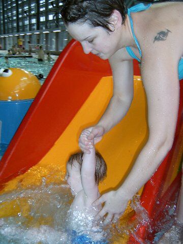Hij is dan niet te houden: trapje op, water door, glijbaan op, glijbaan af, water slikken, oei...kopje onder, ...trapje daar en trapje hier, bubbelbad lekker warm, golven op en neer...! Energie voor 10, maar plezier des te meer. En eens dat allemaal op is... dan is hij volledig uitgeteld... De weg naar huis heeft hij volledig geslapen, en nu nog ligt hij in dromenland! Ik denk dat hij alle golven aan het tellen is!
