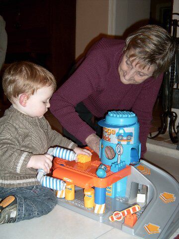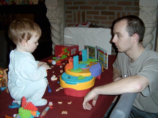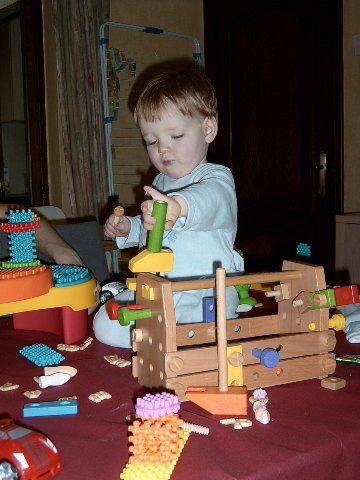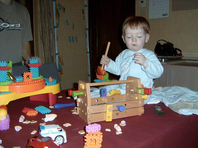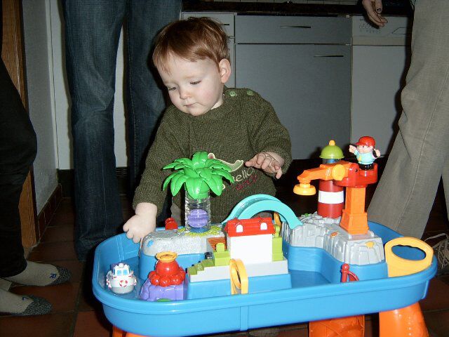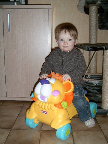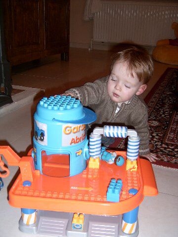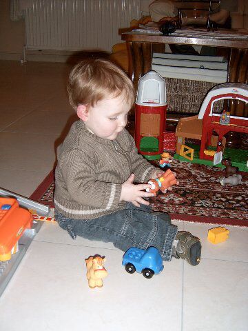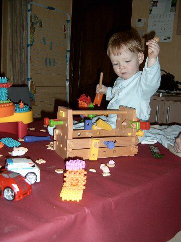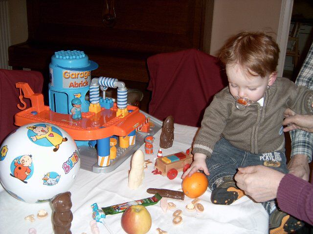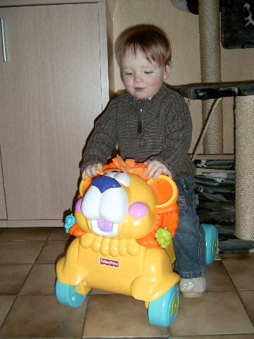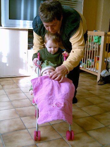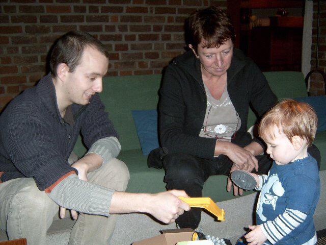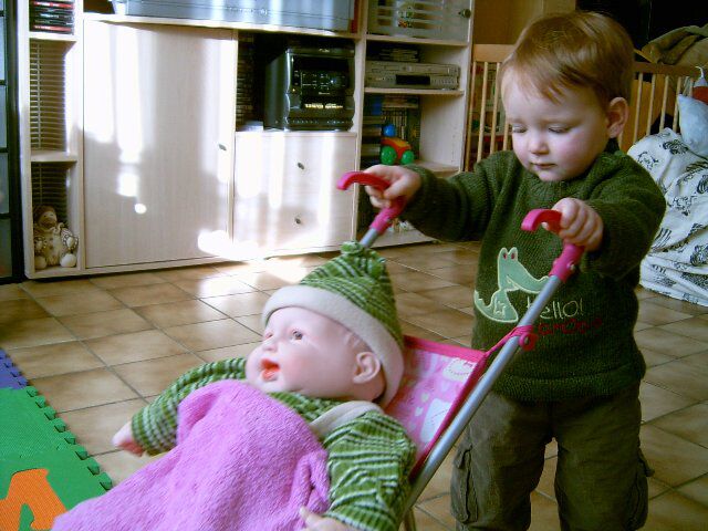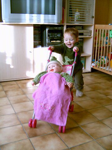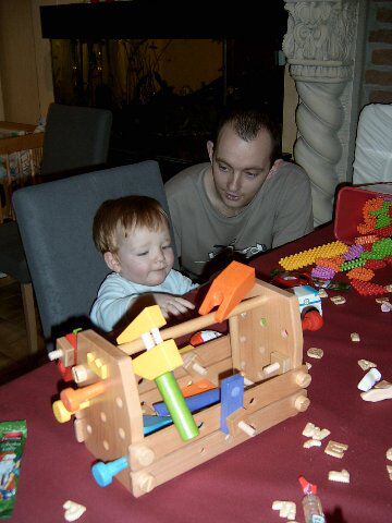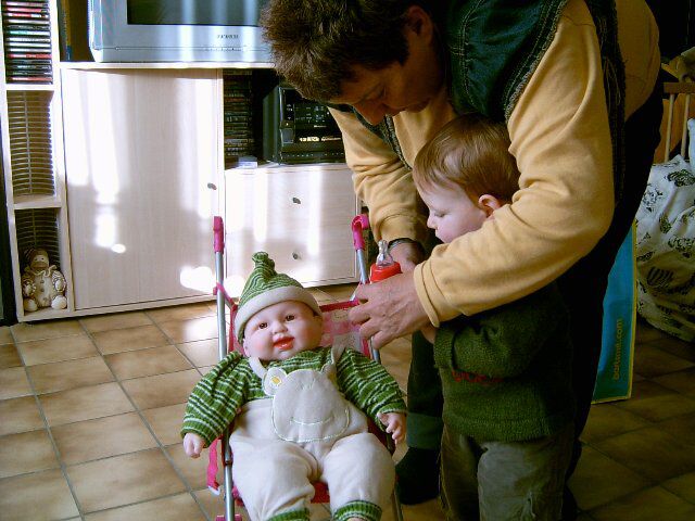 Ik begin me stilaan wel een beetje te schamen, voor het aantal cadeautjes die Siebe mocht ontvangen... Niet te doen gewoon. Maar hij geniet er volop van, en dat mag ook wel gezegd worden. Uiteraard moet er tussen al die cadeautjes een passend evenwicht zijn, en ook daar had de Sint aan gedacht. Om de traditie van auto's gereedschap en bouwmateriaal even te onderbreken, zorgde hij voor een leuke pop met wagen. En Siebe? Zo fier als een gieter paradeert hij door het huis, en hij zorgt zelfs regelmatig dat zijn kleine vriend tijdig drinkt uit de fles! Echt grappig, dat hij onmiddellijk weet wat er moet gebeuren... (Wie weet, als we hem leren de pamper te doen van die kleine rakker, dat hij zijn eigen afgunst voor dit proces vergeet???) Bedankt Sint!