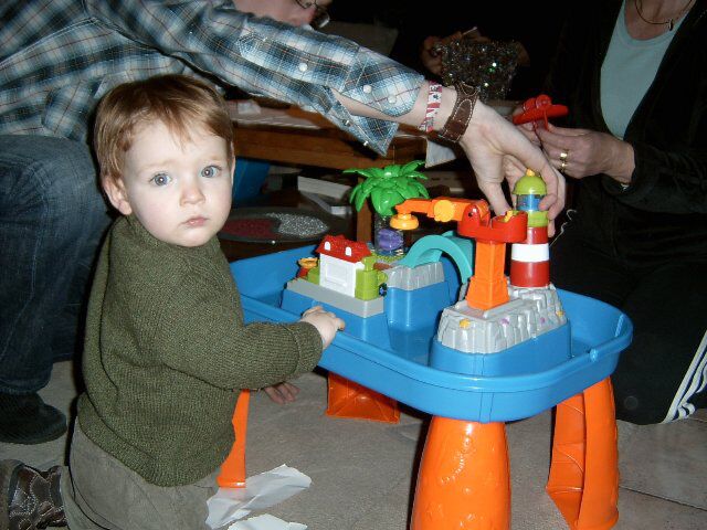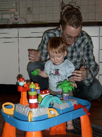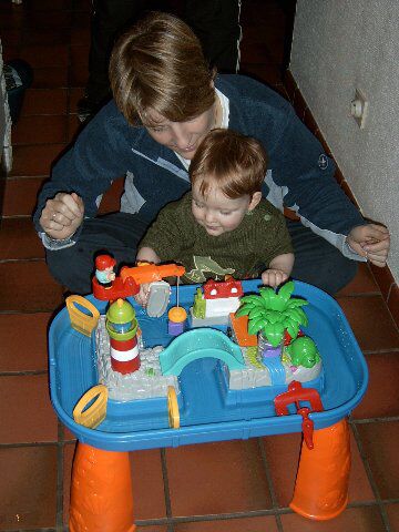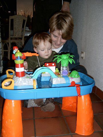 En blijkbaar is Siebe welerg flink geweest, want de Sint heeft nog vanalles inpetto voor onze kleine neus... Sint leverde ook cadeautjes af bij Ine (meter) en bij Bert (peter) Van Ine hebben we ammer genoeg nog geen foto's gemaakt, maar dat komt nog wel! Als Siebe zijn auto volop uittest, met al die knopjes en geluiden. Bij zijn peter was ht een heel ander verhaal: hier was het thema WATER. Toch groot plezier van Siebe! Het resultaat was een natte broek, natte schoenen, natte sokken, en vooral een zeer natte vloer! En Siebe? In de wolken natuurlijk, met al dat gespetter! Bedankt Sint!