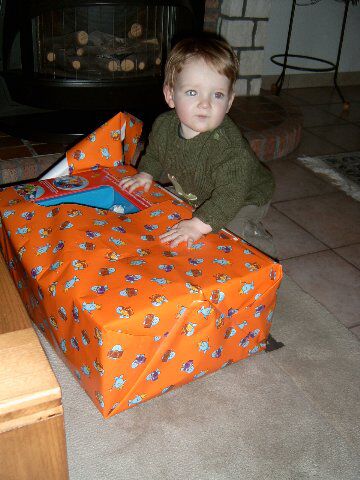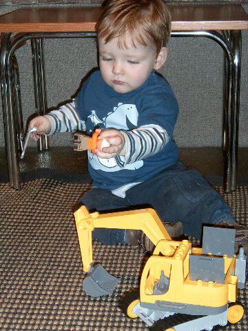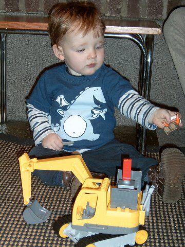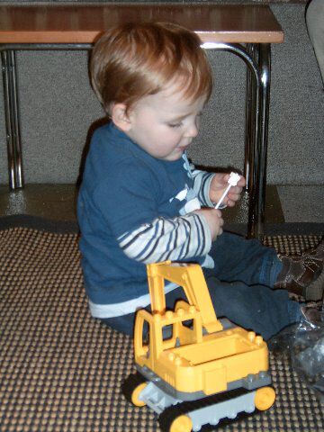 Pakjes uitpakken gaat door al die cadeautjes steeds beter. (Dat belooft!) Het papier wordt er al snel ronduit gedaan, en niet meer bekeken, zodra dat echte geschenk verschijnt. Zo ook bij de Sint van Kortessem. Een heuse graafmachine (om bij nonke Sam te gaan helpen! ) kwam er te voorschijn. Wat zal dat een plezier geven als Siebe echt leert spelen en verhaaltjes opbouwen met de rest van zijn speelgoed!