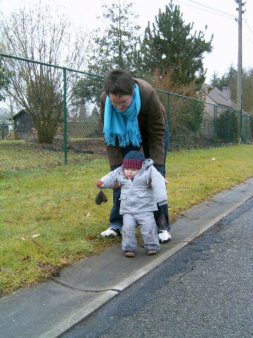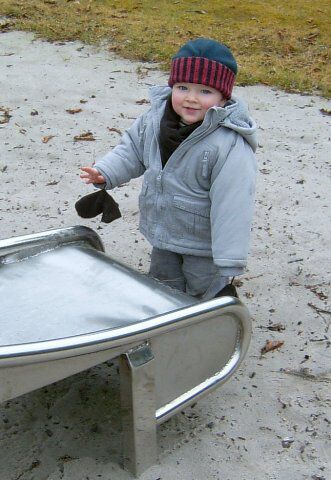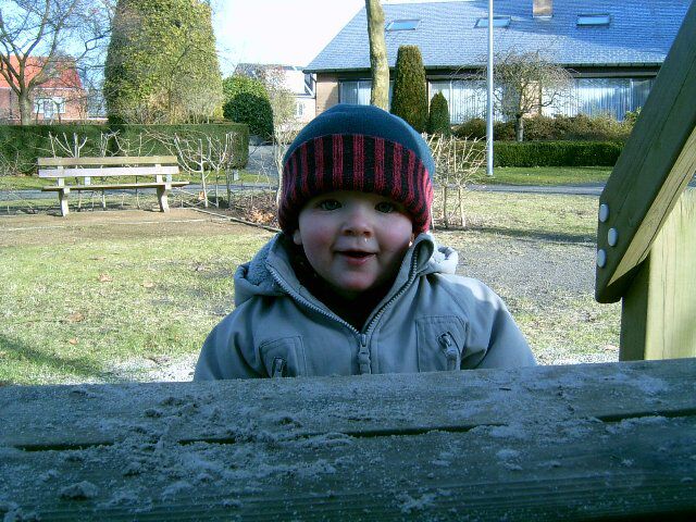 Siebe ging controleren of zijn speeltuintje op het plein, de zware koude had doorstaan! Zelf tot ginder stappen, zelf de glijbaan doen, ... het hoort er allemaal bij!