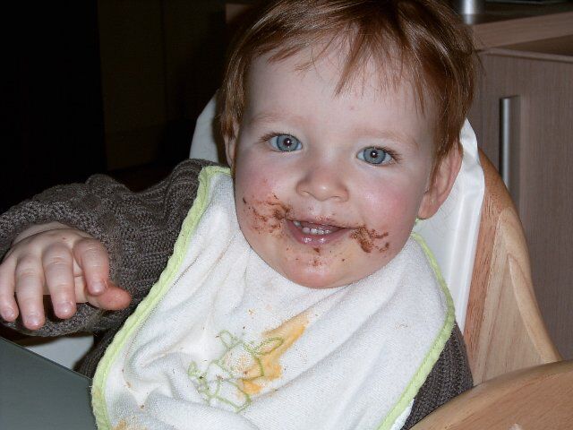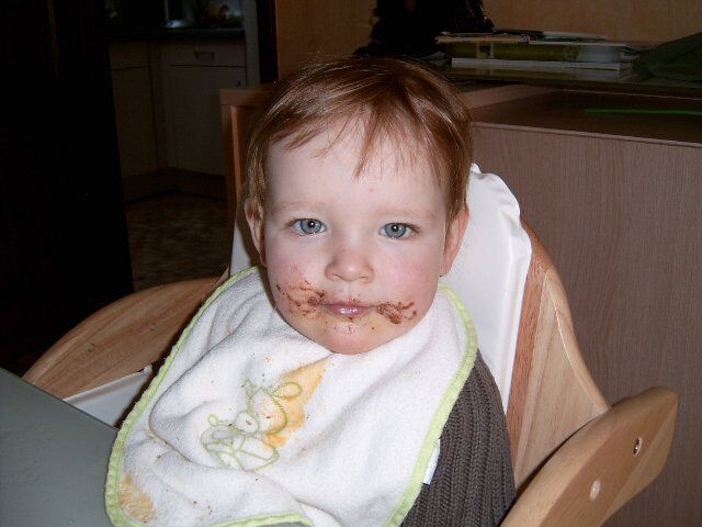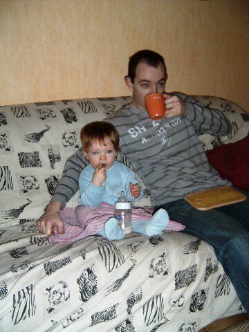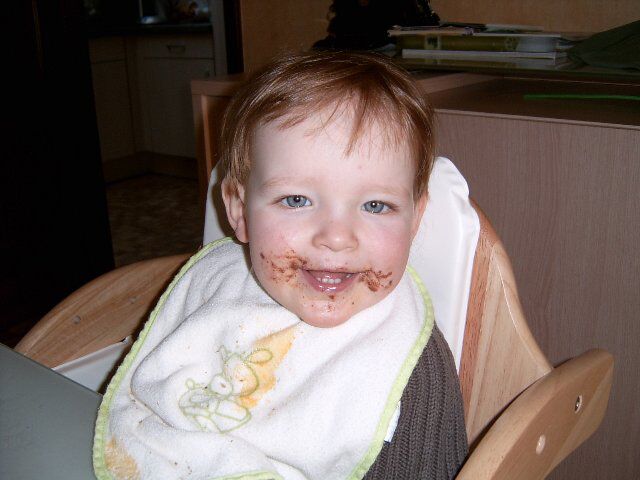 Vandaag had Siebe weer een superdag! Hij kon de hele dag naar Han, want daar hadden ze geen school! Ze zijn gaan zwemmen, buiten spelen, ... Hij is er nu nog moe van! Van de dag zelf heb ik geen foto's, maar wel van de ochtend. Tegenwoordig ontbijt meneer samen met papa in de zetel. Eerst zijn fles, dan papa een koffie en Siebe een boterham met choco! Resultaat: wangen, handen vol choco! Heerlijk ontbijten met papa, of moeten we zeggen: met papa en de tv!
