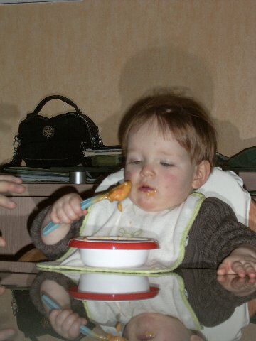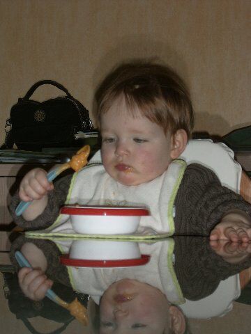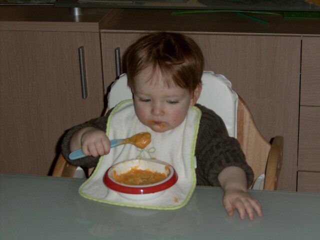 Onze Siebe hield dit weekend een rustig weekendje in huis. Dus weer even tijd om thuis wat foto's te maken van het spelen, knuffelen, en van het eten! De kleine neus eet tegenwoordig alleen. Resultaat: duurt veel langer, veel meer gesmodder, je moet veel geduld hebben, extra wassen en poetsen, maar tegelijkertijd is het knap te zien hoe gefascineerd hij met de lepel het eten neemt en er weer vanaf laat vallen! En achteraf een boterham met ... Ra ra ra, wat heeft Siebe op zijn boterham gehad?! Kaas? Vleesje? ... Ik denk het niet!