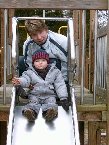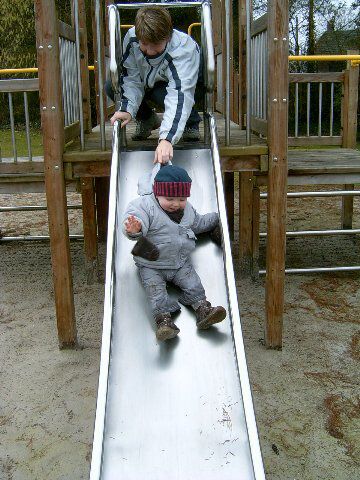 Na al dat stapwerk, komen we dan eindelijk aan de speeltuin. Alles is daar nog erg nat, maar dat trek ik me niet aan. De glijbaan vind ik super, overal op en onder klimmen is gewoon de max!