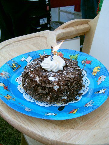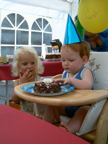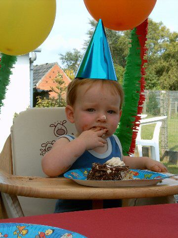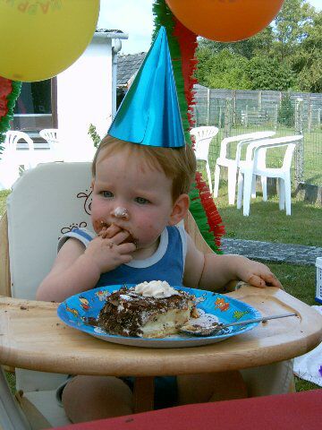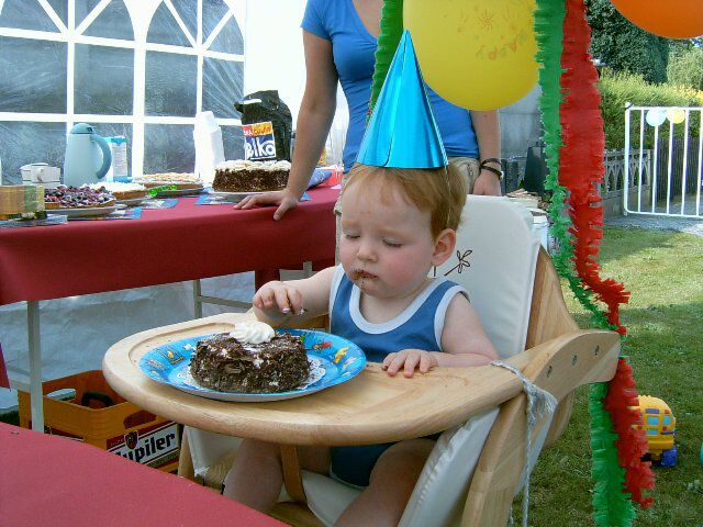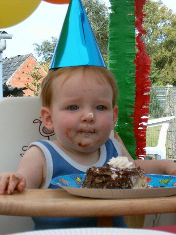En zoals de traditie het voorschrijft, mocht ook Siebe op zijn eerste verjaardag eens echt smodderen! Zijn eigen chocoladetaartje, met 1 kaarsje erop! Uitblazen is er voor hem nog niet bij, dat zullen we oefenen tegen de volgende verjaardag, maar opeten, daar had hij geen uitleg voor nodig. Zeer voorzichtig, met 2 vingertjes, smulde hij vooral van de slagroom en chocolade. Het taartje was achteraf voor de helft verdwenen, deels in Siebes buik, maar ook op zijn snoet, kleren, stoel, handjes... Zoals het hoort, he!