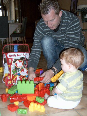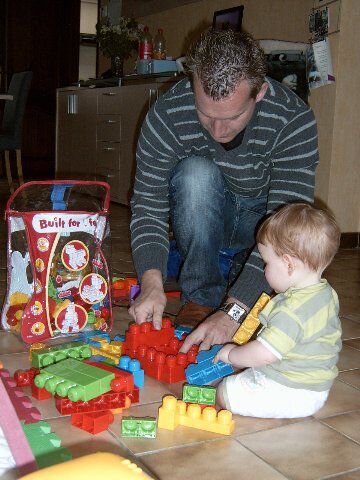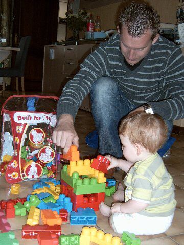 Ook de dag nadien, was er nog een beetje feest. Sam en Inge kwamen hun neefje een gelukkige eerste verjaardag toewensen. (En de overschot aan taart broodjes en soep opeten. Opnieuw een cadeaute, weer mooi ingepakt... En zeer toepasselijk voor iemand in volle bouw van zijn huis, dus kreeg Siebe zijn eigen blokken om mee te bouwen. Maar dat betekent nog niet dat hij devolgende dagen op Sam zijn bouw kan gaan helpen, maar we zullen alvast oefenen!