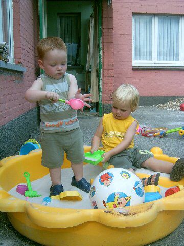 Zoals de foto's al aantonen, blijven Siebes haren maar moeilijk rechtstaan zonder gel, maar verder vindt hij het wel cool. Hij is nog te klein om op de echte bouwwerken van ons huis mee te werken, maar hij oefent wel al bij de werken ten huize Tonneau. Daar helpt hij zijn papa met het uitgraven van funderingen voor de veranda. Alles wordt beloond met een heerlijk plonsbad, een ijsje en daarna een heerlijke douche.