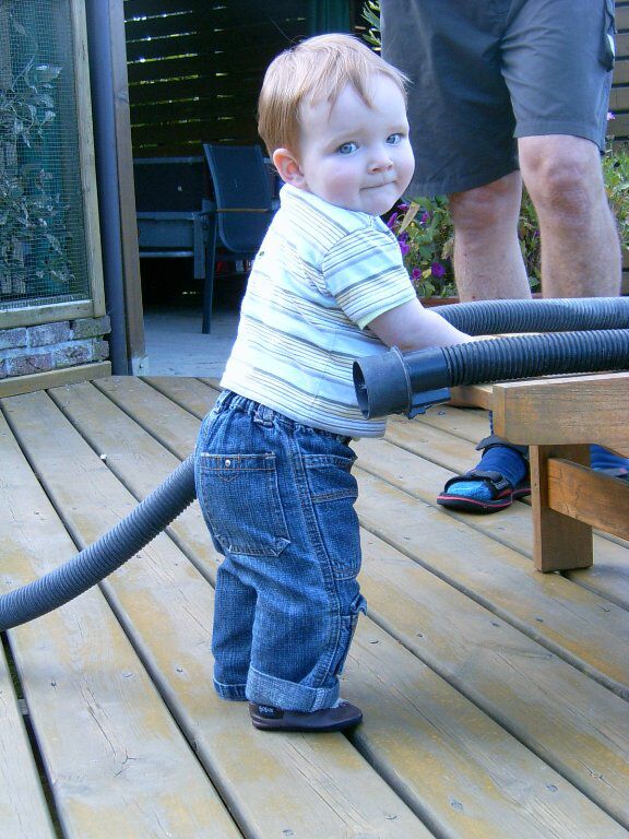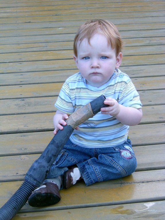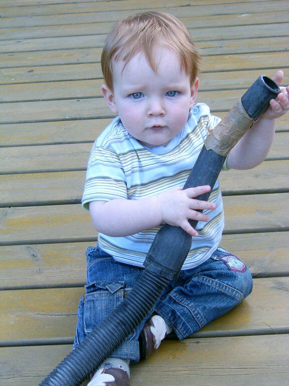 Je zou de 3 volgende foto's eens als een filmpje achter elkaar moeten bekijken. Dan krijg je een aardig staaltje van hoe Siebes snoet veranderen kan! 1) Ik vind een zwarte eigenaardige slang... Wedden dat ik daar eigenlijk niet mee mag spelen?! 2) Ze laten me toch doen! Wel raar zo een ding ... Een bestuderen... 3) Ik wou dat ding dus in mijn mond steken en lap, daar klonk het weer: "Siebe, neen, mag niet!"