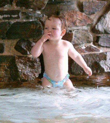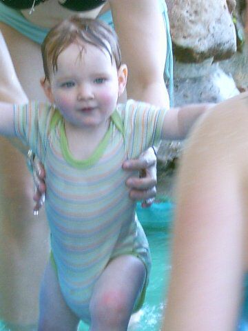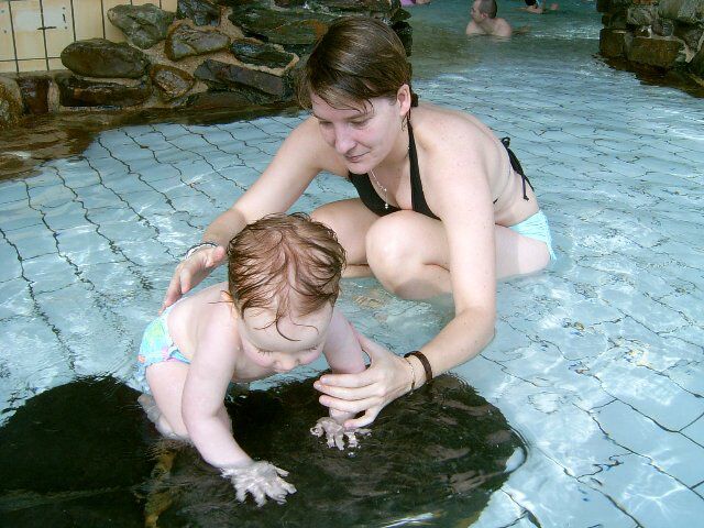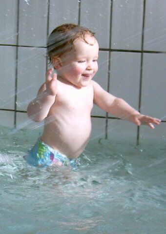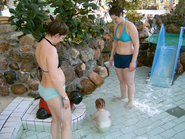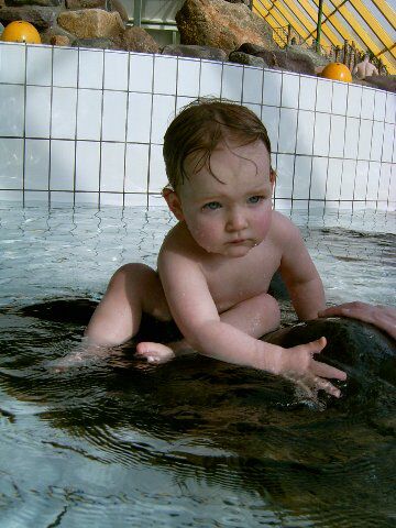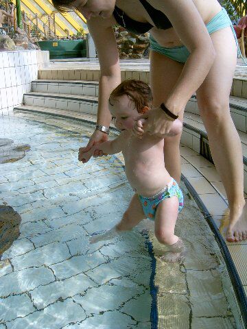 We waren eerst zijn zwembroek vergeten. Dus hebben we als noodoplossing gezwommen met onderhemdje en gewone pamper. Maar toen deze echt te zeer vol water zat, hebben we onze moed bijeen gescharreld en een pamper aan een van de andere klanten gevraagd (Merci Ine!) en dus kon Siebe toch nog, met enkele kilo's minder water, verder ploeteren!