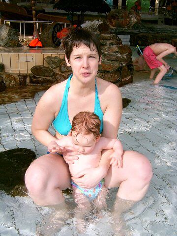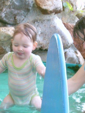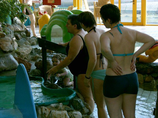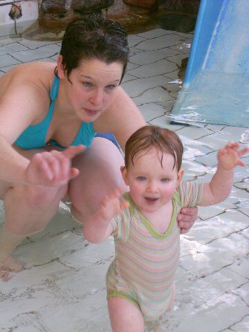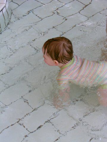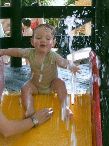 Hij is dan niet te houden: trapje op, water door, glijbaan op, glijbaan af, water slikken, oei...kopje onder, ...trapje daar en trapje hier, bubbelbad lekker warm, golven op en neer...! Energie voor 10, maar plezier des te meer. En eens dat allemaal op is... dan is hij volledig uitgeteld... De weg naar huis heeft hij volledig geslapen, en nu nog ligt hij in dromenland! Ik denk dat hij alle golven aan het tellen is!