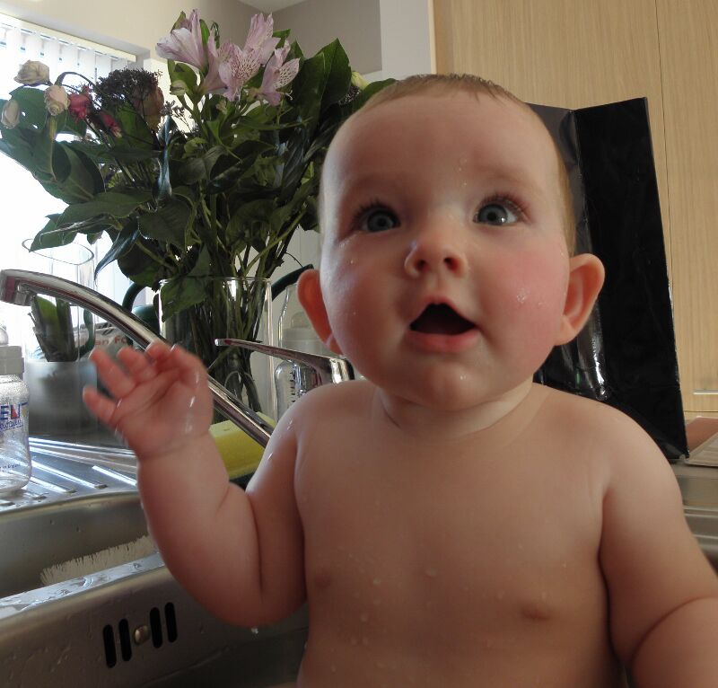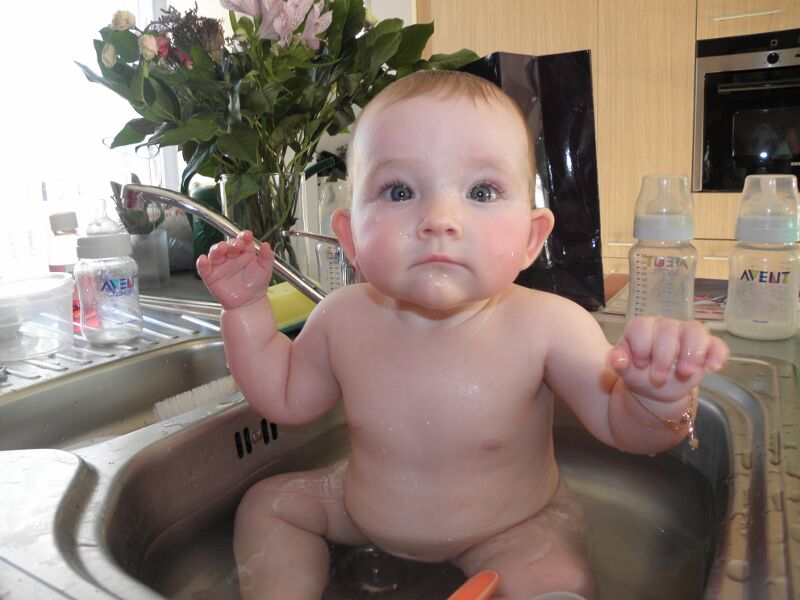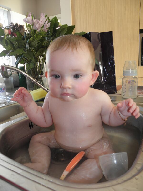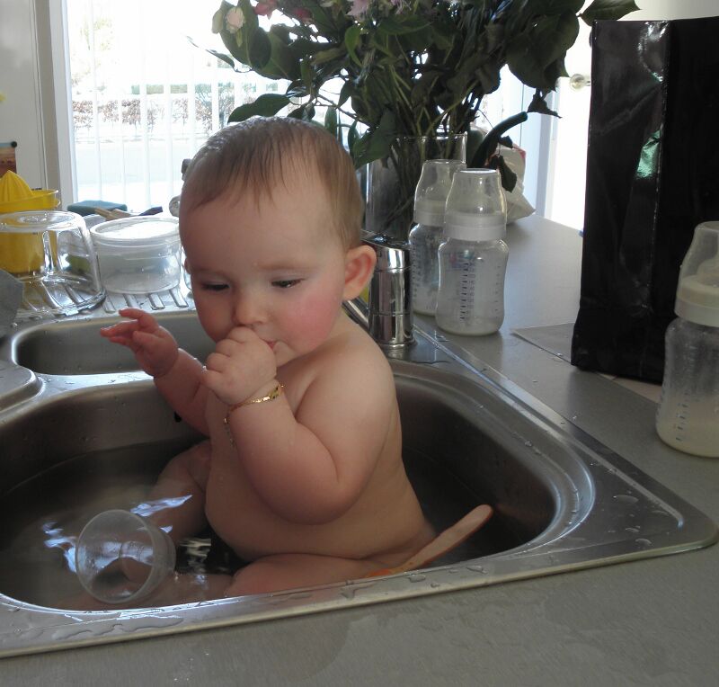 Je hebt zo van die dagen dat kleine meid grote dingen produceert in haar pamper... En als die dan niet goed toe is... Dan is de oplossing nabij: lekker warmwater in de gootsteen... Tussen de afwas, papflessen en andere keukenrommel vind je Svanne op haar best: in het water!