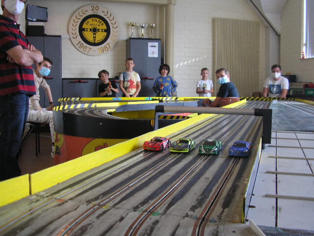 De eigenlijke race 4x 6min., Bert nam van bij de start de leiding, voor Laurent en Peter. Ditmaal was de suprematie van Bert nog uitgesprokener en reed beetje bij beetje zijn opponenten op achterstand. Bert won de race en reed ook de snelste rondetijd, 6sec124/000. Op ruime afstand werd Laurent tweedes en hield Peter eveneens ver achter zich. Danny V kon Peter wel volgen maar hem niet bedreigen. Daniel en Urbain reden een verdienstelijke race maar in het achterveld. En "PAT" staakte in de voorlaatste heat de strijd,, zijn autootje was totaal onbestuurbaar, volgende race beter.