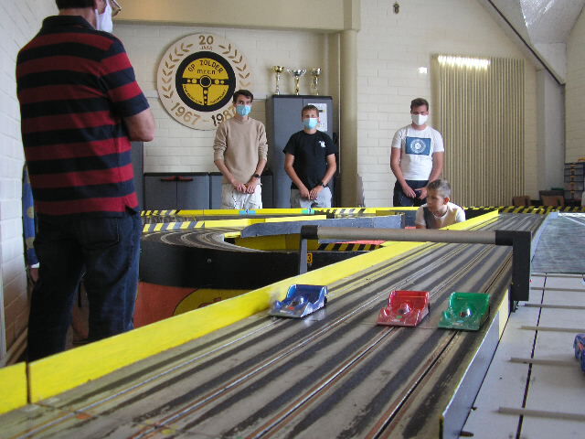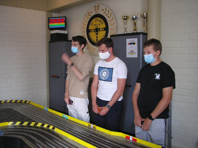 Eerst rijden we een een sprintrace van 4x 2 minuten. De winnaar krijgt 3 punten, de tweede 2 ptn., en de derde 1punt. Nee, wij doen de Formule 1 niet na, dit systeem doen we al jaren. Het werd een strijd tussen Bert en Laurent. Aanvankelijk nam Bert een mooie voorsprong maar Laurent kon zich herpakken en kwam geleidelijk dichterbij. Uiteindelijk kon Bert, Laurent voorblijven, Peter kon wel het ritme van de kemphanen volgen maar bedreigen dat nooit, wel reed hij de snelste laatste heat.