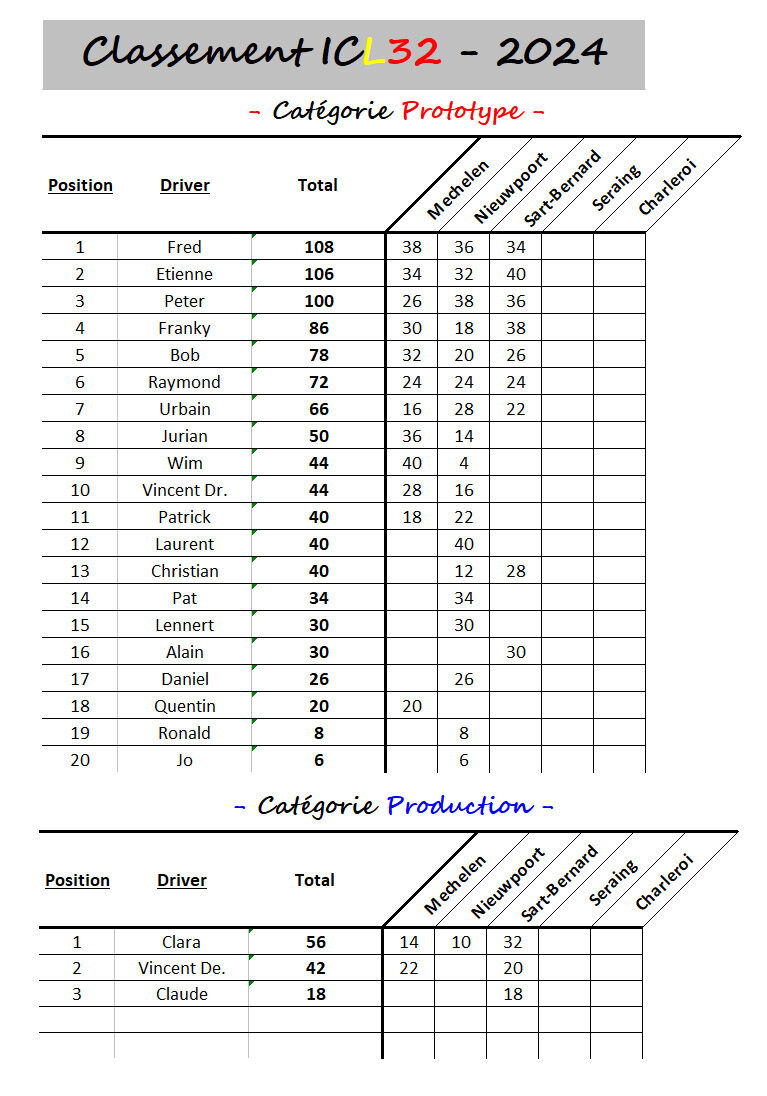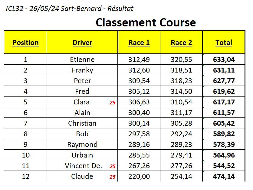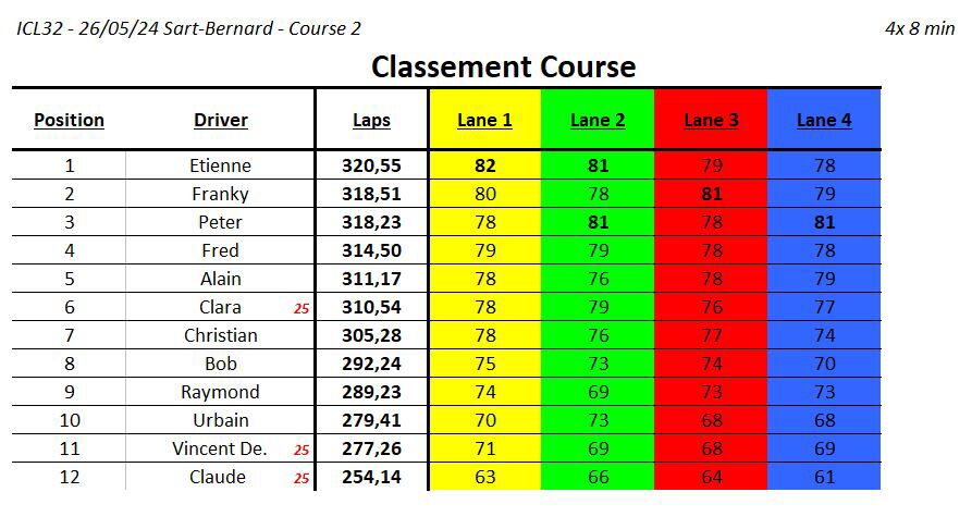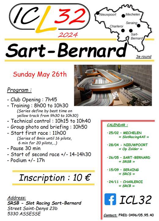 19 piloten aan de start van de tweede race tellend voor het ICL32 kampioenschap, wedstrijden voorbehouden aan wagentjes op schaal 1/32 met metalen chassis en lexan carrosserien ( GT en LMP). Uiteraard waren er piloten van de eigen club maar ook uit Mechelen, "Slotracing4All", Sart-Bernard, "SRSB", Charleroi, "SRCB" en Cerfontaine, "Slot'Heure".