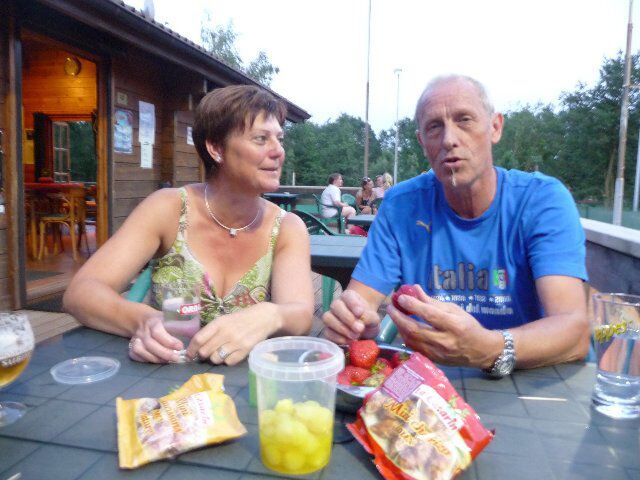 Maandagavond is tennisavond. Na een inspanned matchke, Jet en ik waren nog eens gewonnen tegen Ivo en Monique, is het dan nog gezellig wat bijpraten met wat lekkers op tafel. monique had aarbeien bij, ik een potje Amsterdamse uien en Ivo wat worstjes. Hier dus het winnende koppel van de volgende ontmoeting Roger was ook van de partij, die had gezien dat we goed gespeeld hebben.