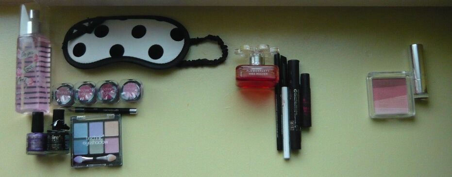 Claire's: 1.Do you love me Body Mist 2.Slaapmasker 3.technic eyeliner pencil 4.Dit zijn 4 Technic lipglossjes 5.Technic eyeshadow 6.Paarse glitter nagellak 7.Zwarte crackle lak (op papier werkt deze nagellak niet goed)