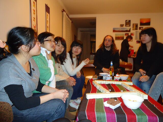 Mahjong met de familie Tang (de vrouw links is Tang)
