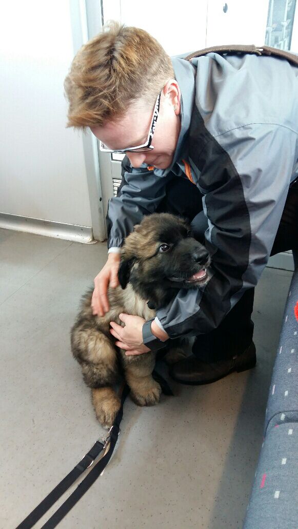 Zaterdag: Mijn baasje werkt in de trein, en daarom wil ze dat ik absoluut gewoon word om in de trein te zitten. Pas op, ik zie dat ook wel zitten hoor . Rusten tot aan de zee, dan lekker ravotten in het zand en een beetje zwemmen, en dan rustend terug naar huis. We hebben een kort ritje gedaan, en ik was heel flink, zelfs de goederentrein die op het perron voorbij kwam deed me niets. Even goedendag gaan zeggen aan de collegas en eens oefenen in een lift en dan mee naar een tuincentrum. Daar kon ik op verschillende ondergronden wandelen, voelde goed aan mn pootjes.