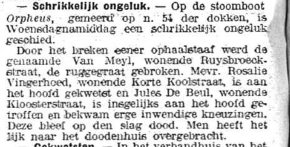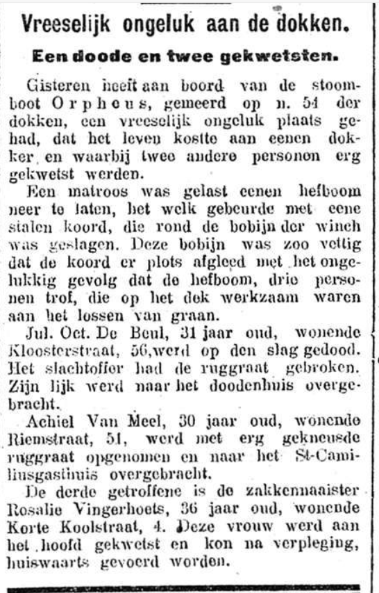 Gezocht in KBR, maar GvA 19/09/1912 niet beschikbaar. In HLN van die dag spreekt wel over een "Schrikkelijk ongeluk" (sic) op n. 51 der dokken: https://uurl.kbr.be/1244233