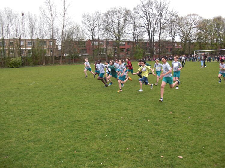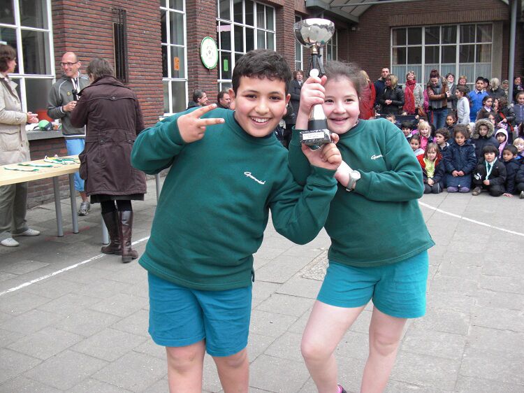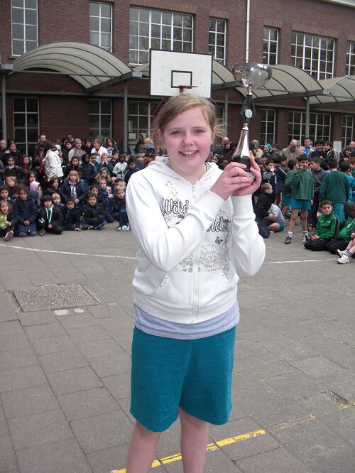 De aflossingswedstrijd van het 5de leerjaar werd gewonnen door onze meisjes. Wiebe, Sharon, Inass en Kaat haalden het in een zeer spannende wedstrijd.