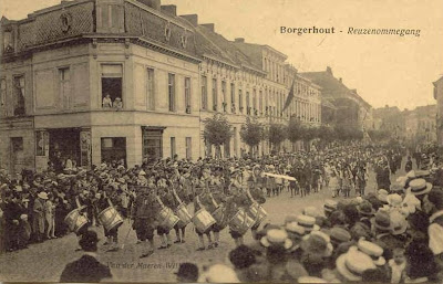 En daar komt de Reuzenstoet. Ergens in de verte dan toch, op de foto moeten we het nog doen met het voorspel: de trommelaars. We zullen nog maar even wachten, ze zullen zo komen.