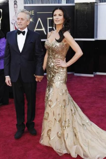 Catherine Zeta-Jones met een prachtig gouden kleed! Hier hand in hand met echtgenoot, Michael Douglas