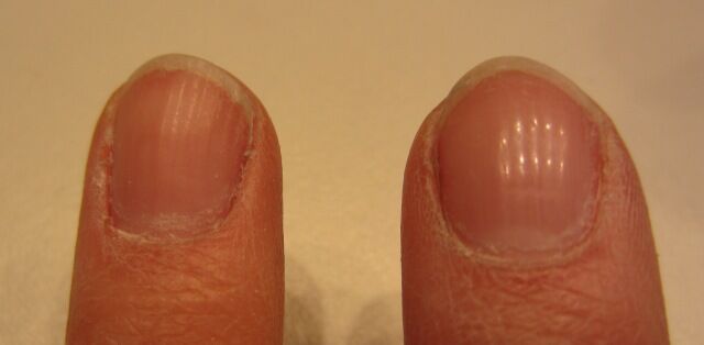 Je ziet een duidelijk verschil tussen de niet-gepolijste (links) en wel gepolijste nagel (rechts).