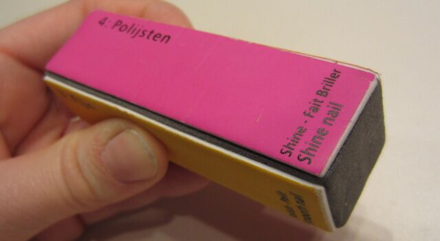 Om mijn nagels bovenop ook glanzend en mooi te krijgen gebruik ik een buffer. Dit is een vijl met verschillende vlakken waarmee je het bovenvlak van de nagels vijlt. Dit noemt men ook wel polijsten.